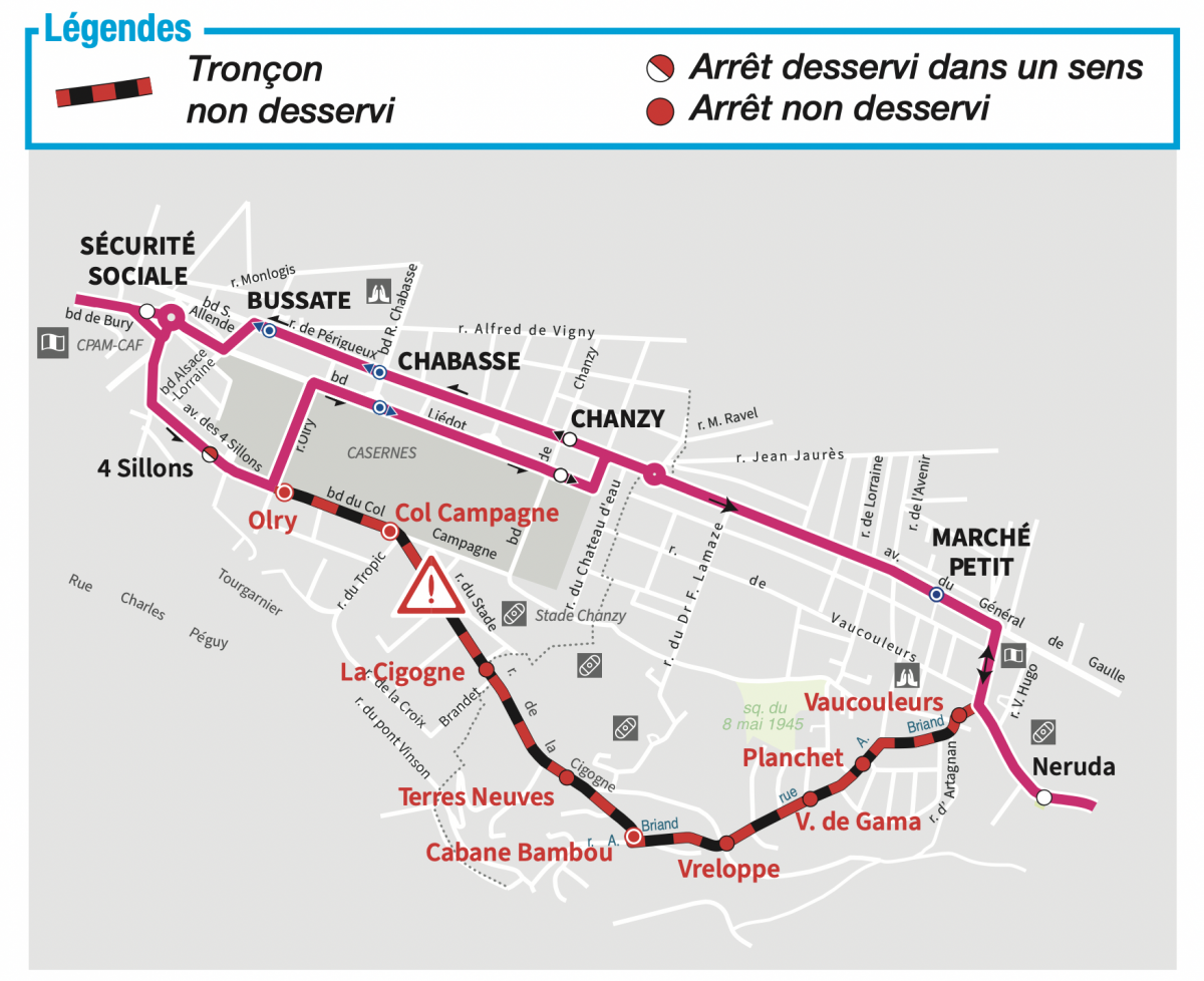Les arrêts "4 Sillons" (vers Fléac), "Olry", "Col Campagne", La Cigogne", "Terres Neuves", "Cabane Bambou", "Vreloppe", "V. de Gama", "Planchet", et "Vaucouleurs" ne seront pas desservis.