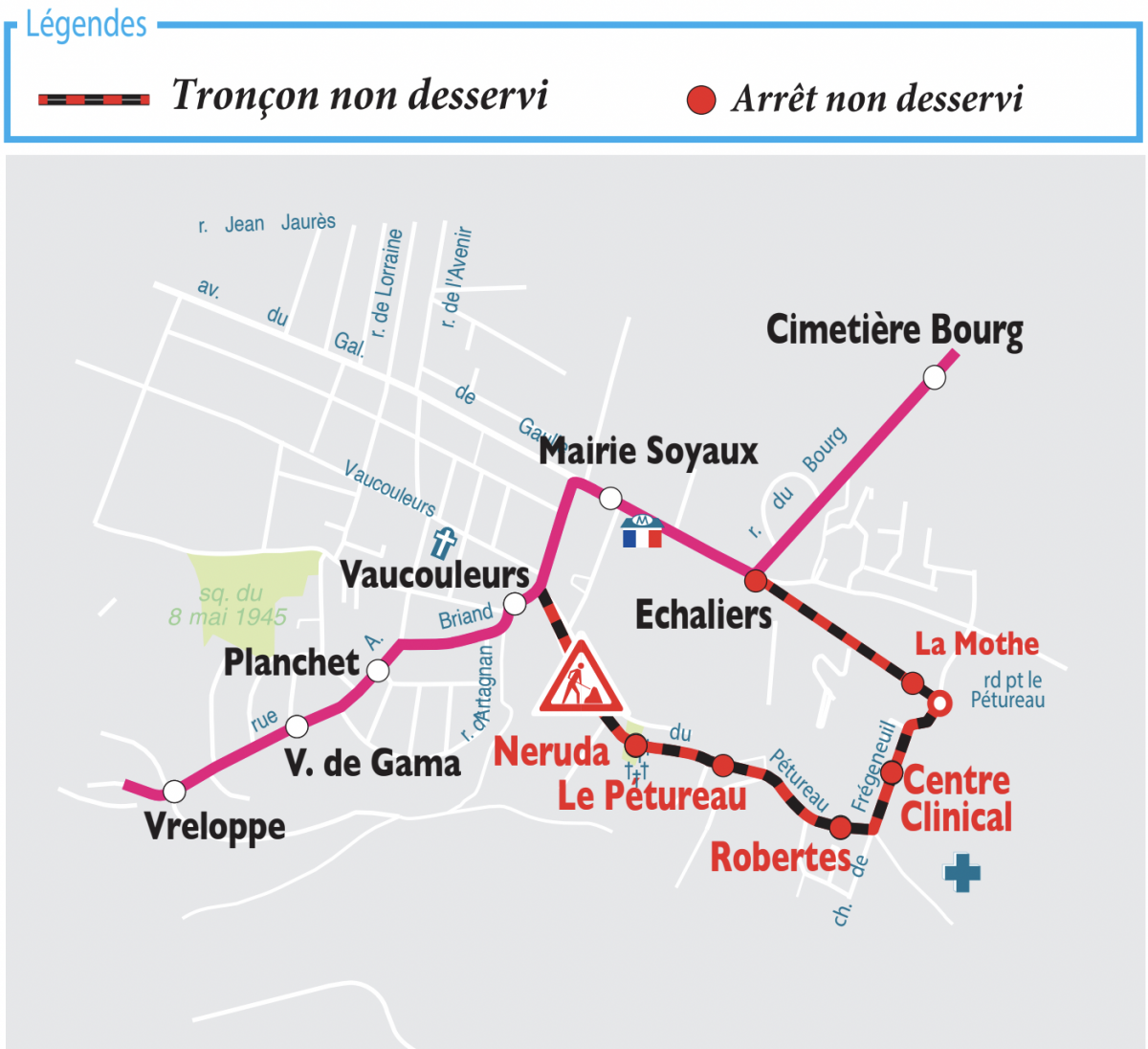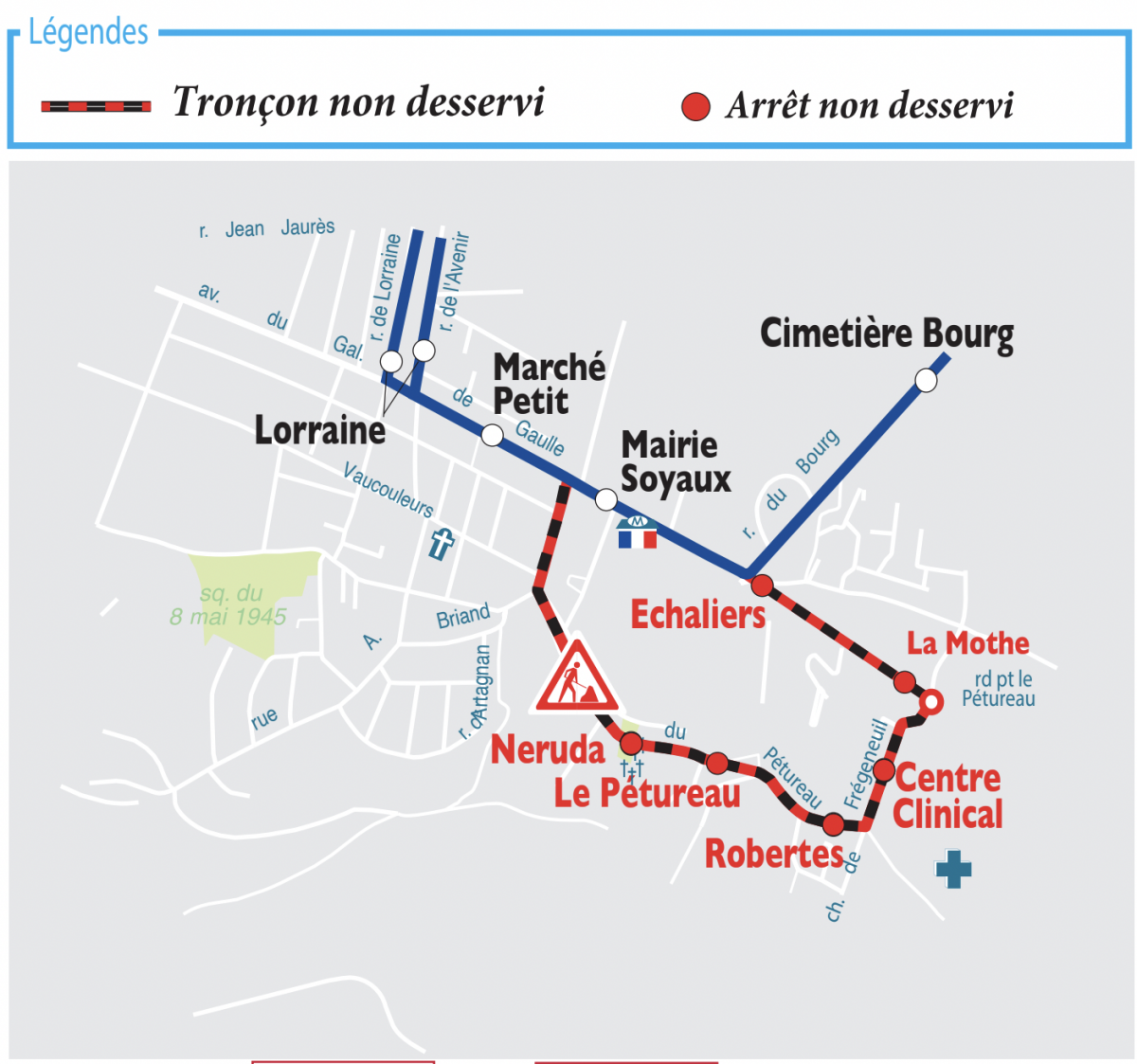 Les arrêts : "Neruda", "Le pétureau", "Robertes", "Centre clinical", "La Mothe", "Echaliers" ne serront pas desservis.