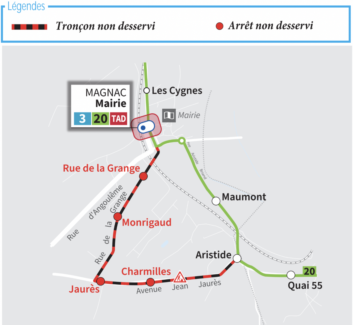 En raison de travaux dans la rue Jean Jaurès à Magnac, les bus de la ligne 20 seront déviés dans les deux sens entre les arrêts "Aristide" et "Magnac Mairie".