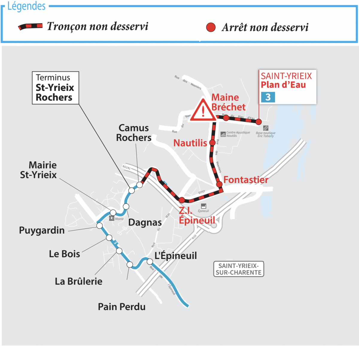 Dimanche 5 Octobre de 9h30 à 14h environ : arrêts non desservis entre "Z.I L'Epineuil" et " St Yrieix Plan d'eau".