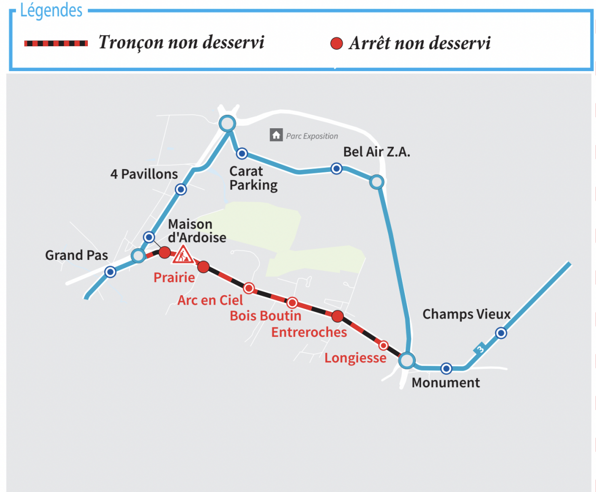 En raison de travaux , Avenue de Montbron entre les arrêts "Maison d'ardoise" et "Longiesse", les bus de la ligne 3 seront déviés dans les deux sens par l'Avenue jean Mermoz, carat, et D1000
