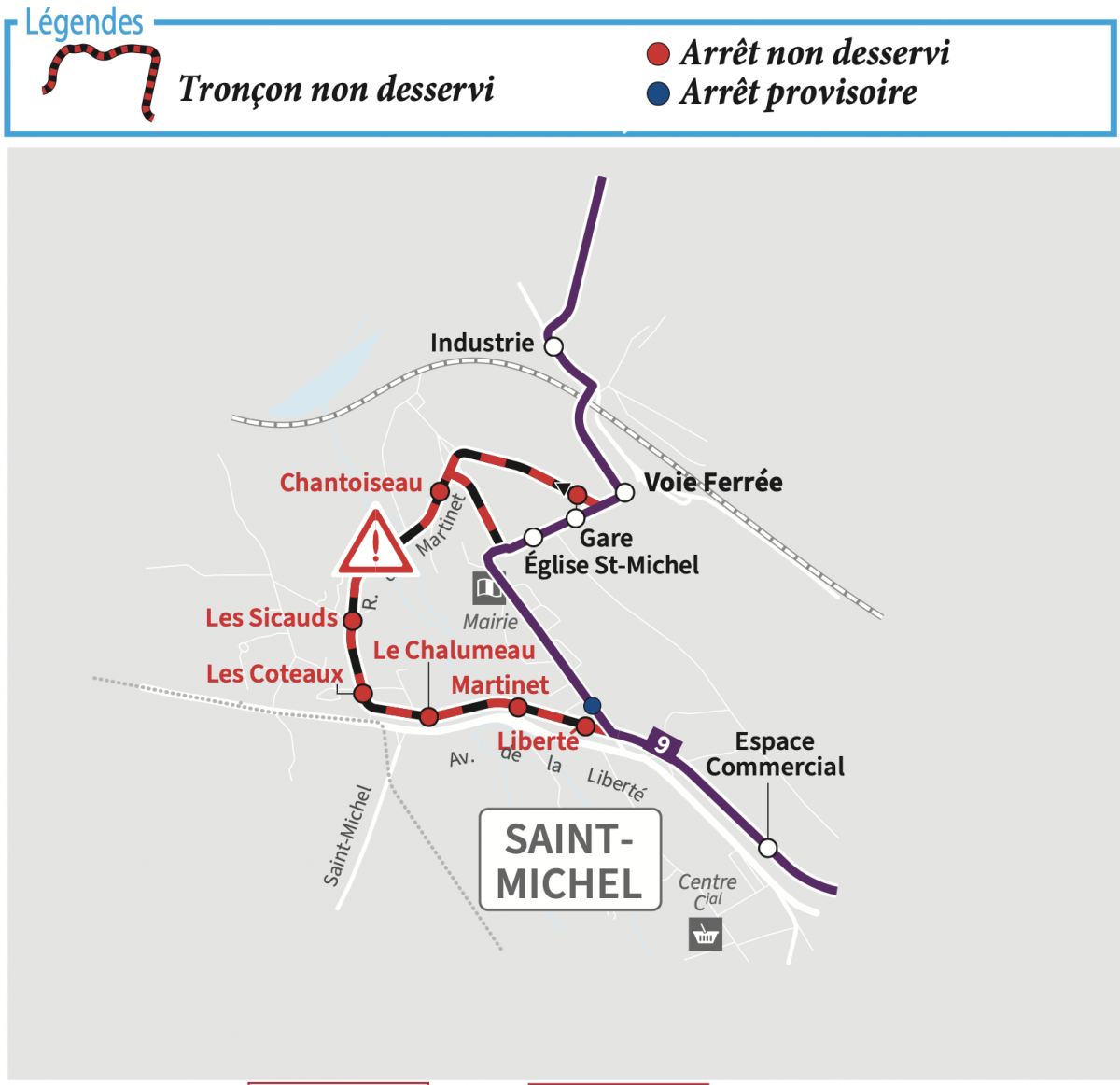 Les arrêts "Liberté", "Martinet", "Le Chalumeau", "Les Coteaux", "Les Sicauds" et "Chantoiseau" ne sont pas desservis.