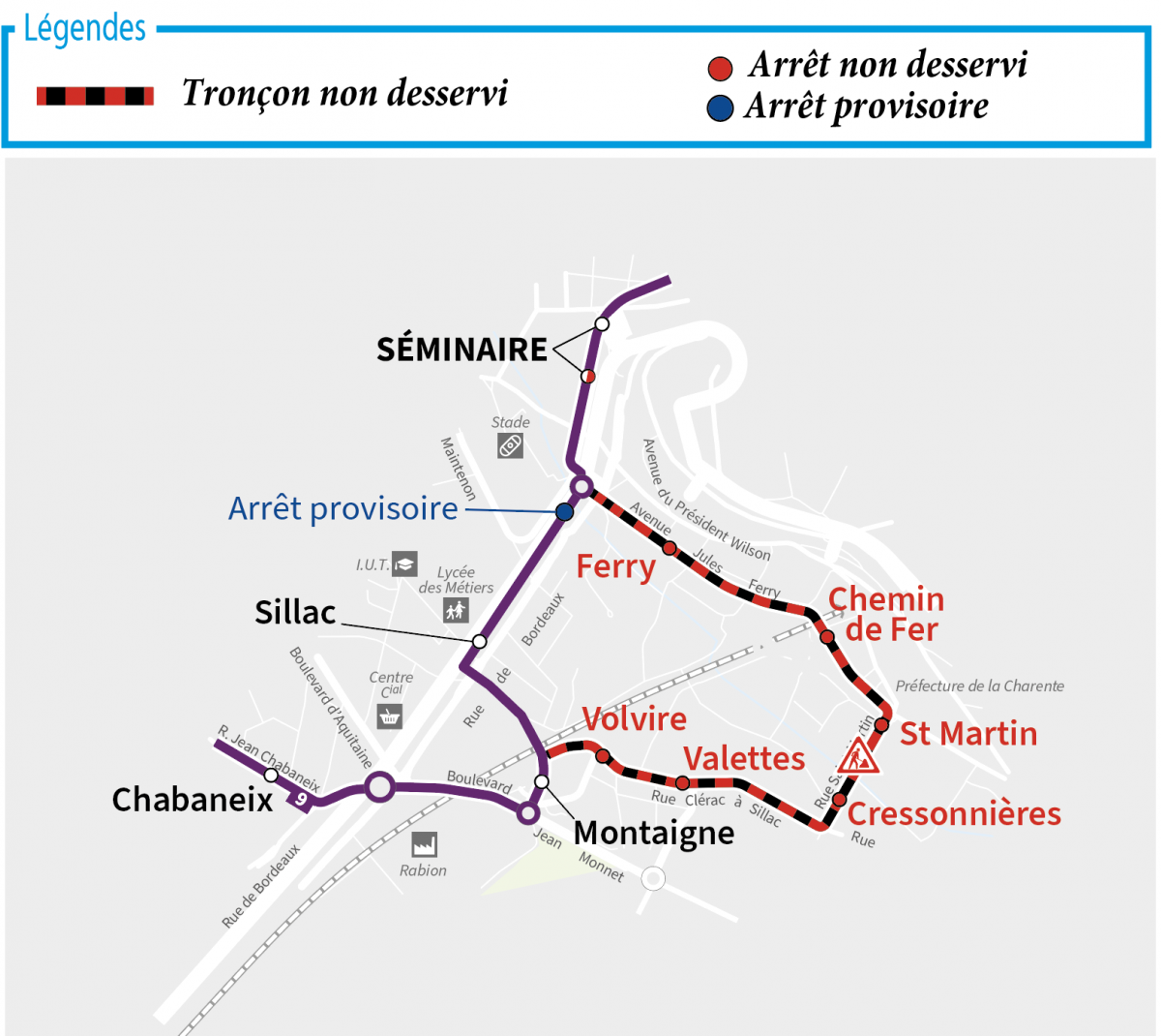 Les arrêts "Volvire", "Valettes", "Cressonnières", "St Martin", "Chemin de Fer" et "Ferry" ne seront pas desservis.