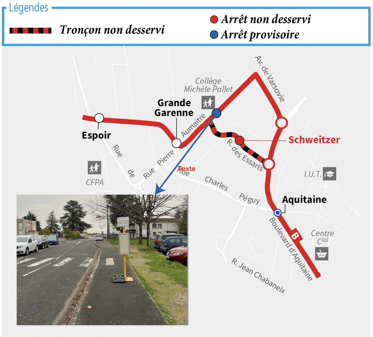 Nous vous invitons à vous reporter aux arrêts "Aquitaine", "Grande Garenne" ou au niveau du poteau provisoire situé rue Pierre Aumaitre, au niveau du collège Michèle Pallet.