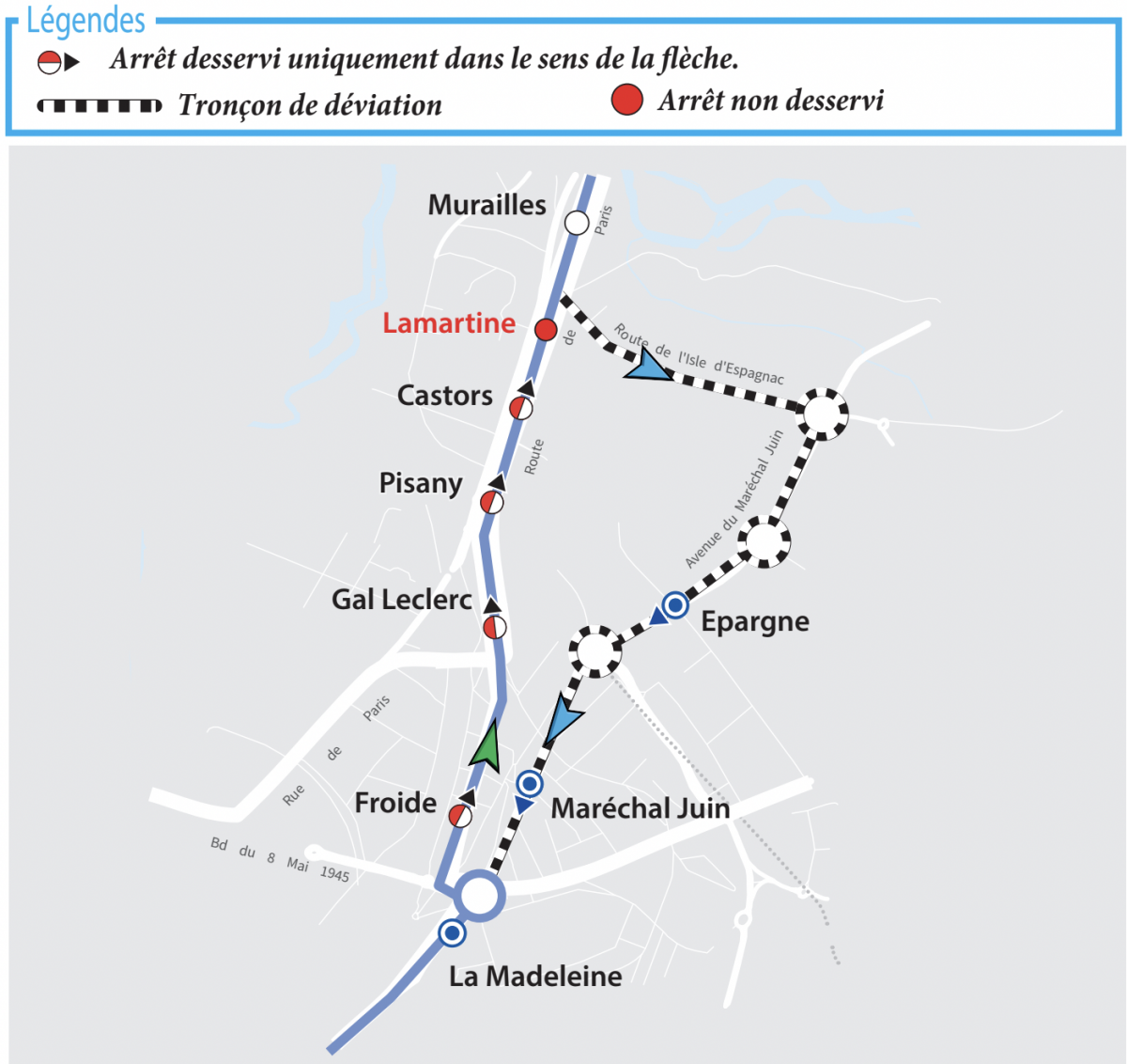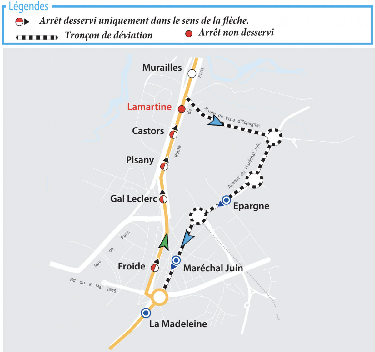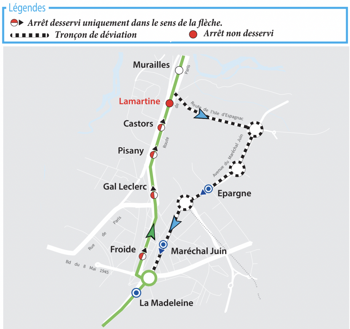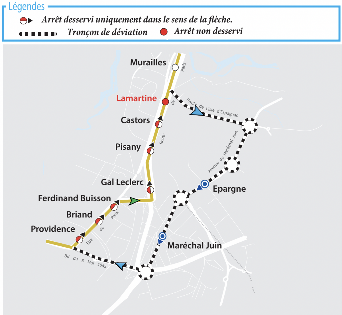 En raison de travaux travaux sur l'arrêt "Lamartine", les bus seront déviés en direction de Angoulême Fregeneuil par la route de l'Isle d'Espagnac et l'Avenue du .M.Juin.