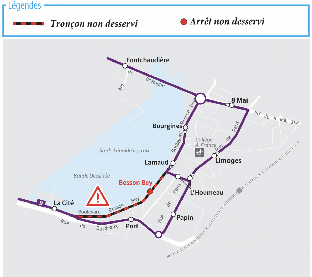 -Vers Isle d'Espagnac par le Bld de Bretagne, le Bld Besson Bey, la rue Lamaud, rue de Paris et Rt de Bordeaux entre les arrêts jeanne d'Arc" et "Séminaire"