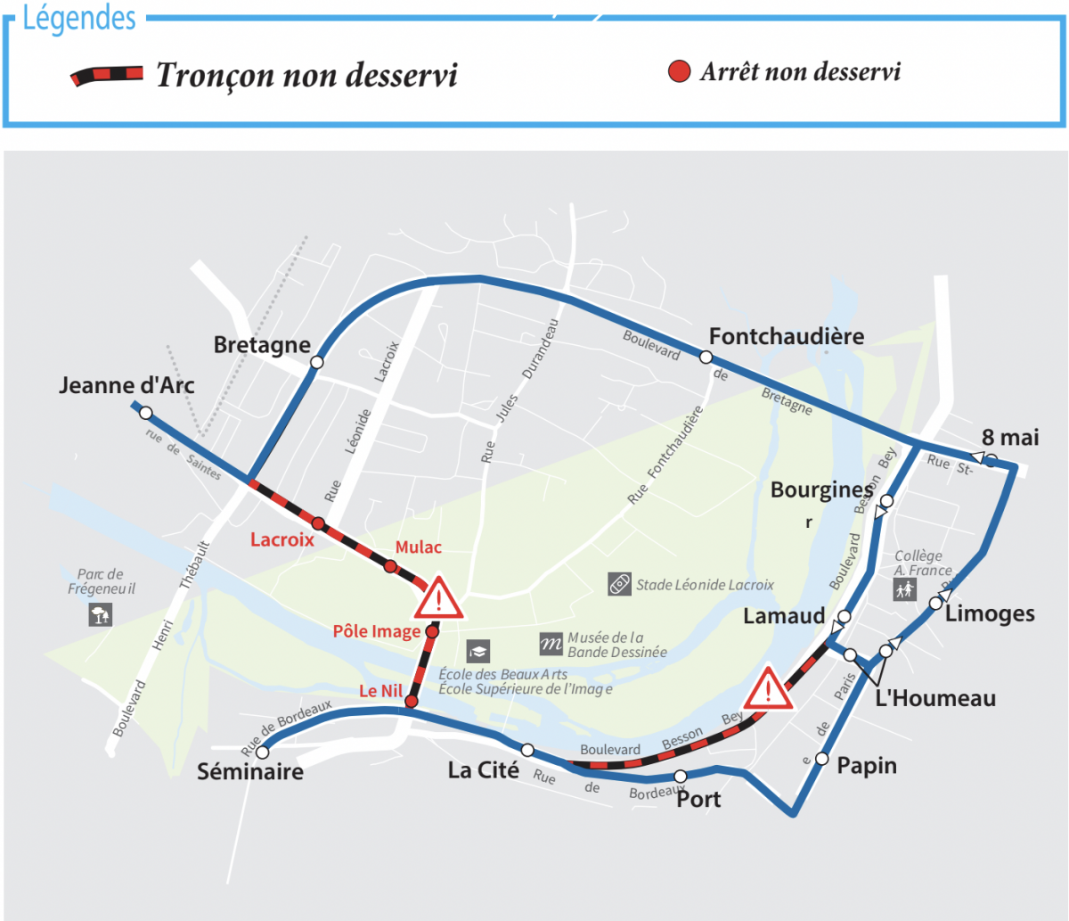 - Vers Saint Yrieix Plan d'Eau par la rue Bordeaux, la rue de Paris, Rue St Antoine et le Bld de Bretagne entre les arrêts Séminaire" et "Bretagne".