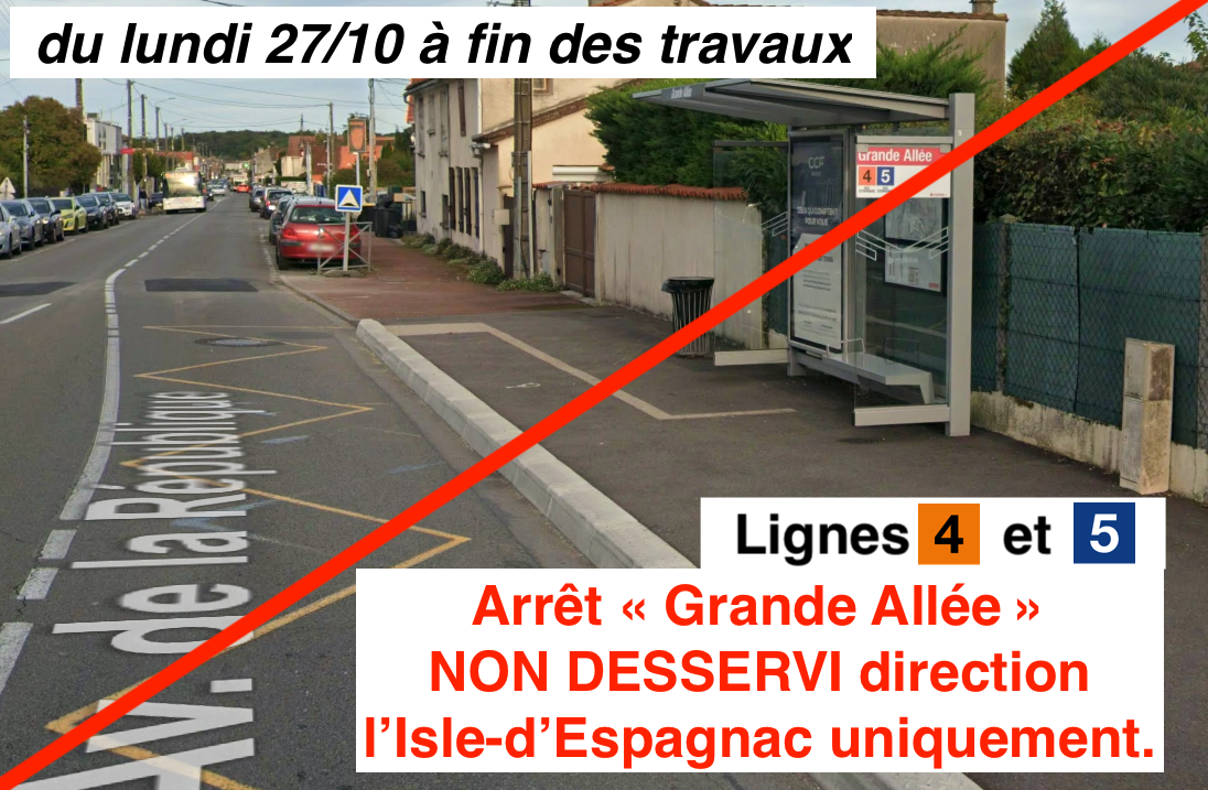 L'arrêt "Grande Allée" ne sera pas desservi direction L'ISLE D'ESPAGNAC (CCI Campus Nord et Bel Air Z.A.) uniquement.