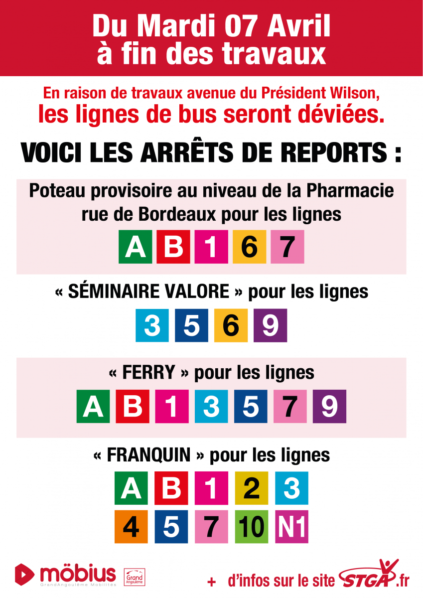 En raison de travaux Avenue du Président Wilson, les bus seront déviés dans les deux sens par la rue Jules Ferry, la rue Renoleau, la rue Montmoreau et le Bld Berthelot.