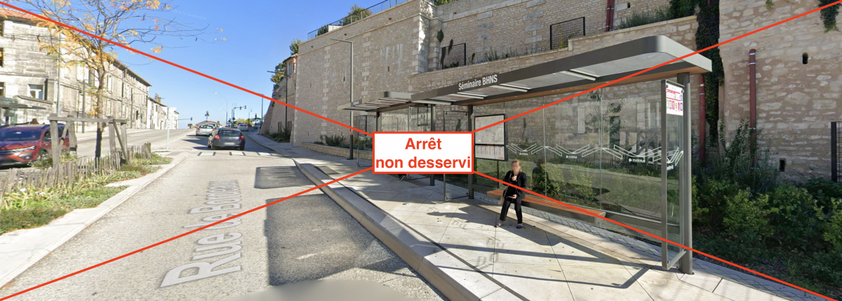 En raison d'une intervention suite à un risque d'éboulement aux abords de notre arrêt "Séminaire BHNS", cet arrêt ne sera pas desservi en direction du Jardin Vert uniquement.
