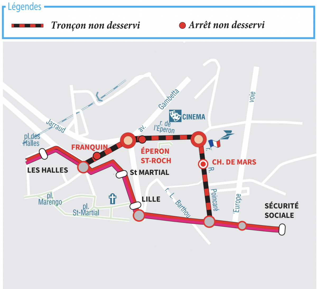 Merci de vous reporter à l'arrêt "Les Halles", "Sécurité sociale" ou "St Martial" et "Lille"