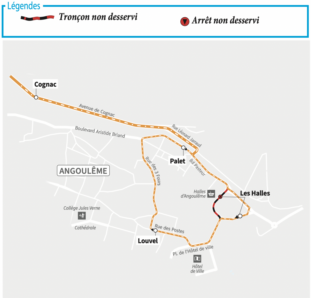 L'arrêt "Les Halles" (rue du Chat) ne sera pas desservi.