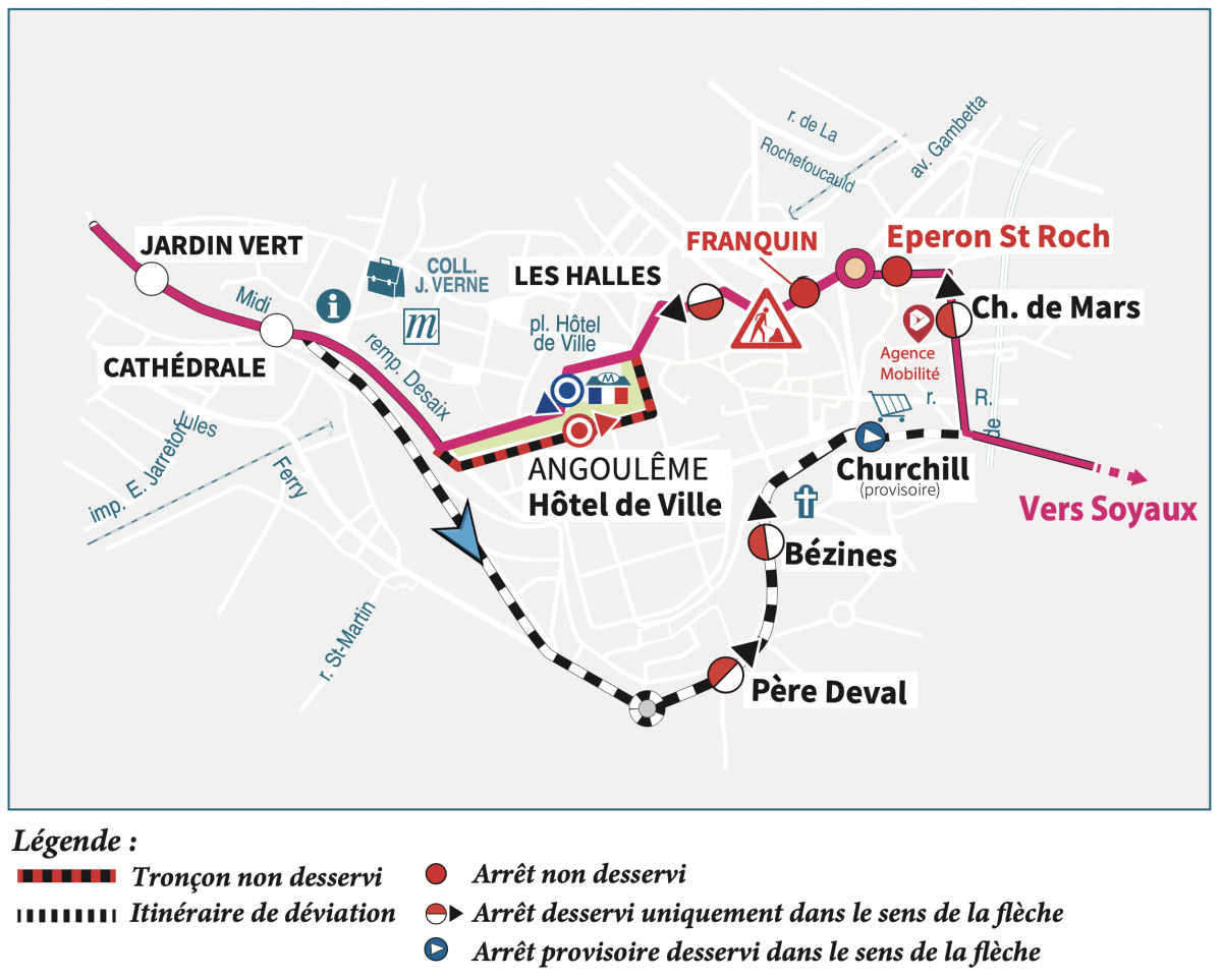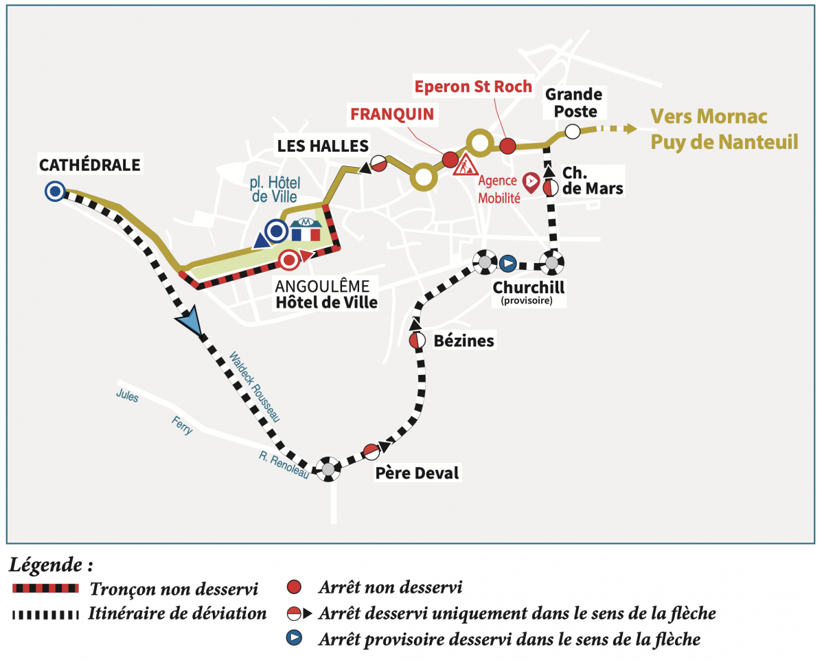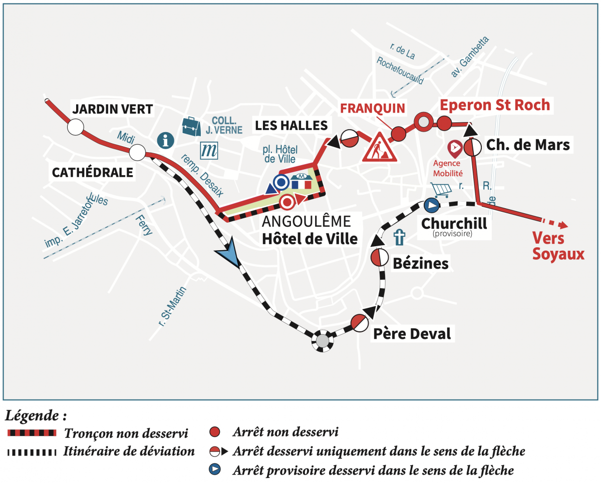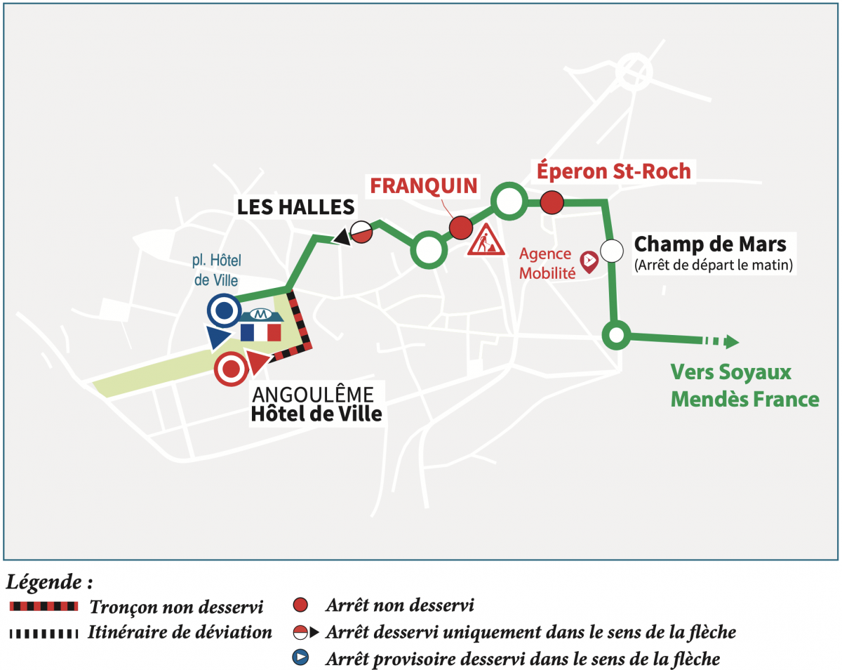 Direction Soyaux (matin) : nous vous invitons à vous reporter à l'arrêt "Champ de Mars" (départ de la ligne).
