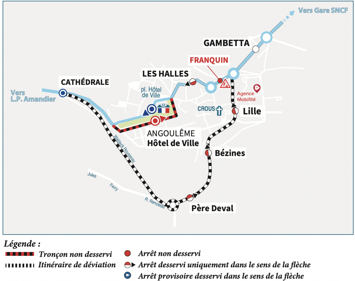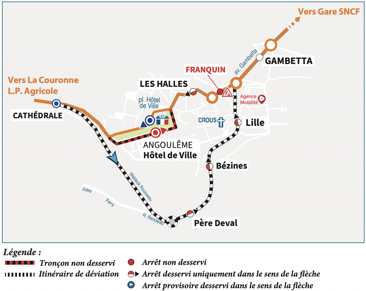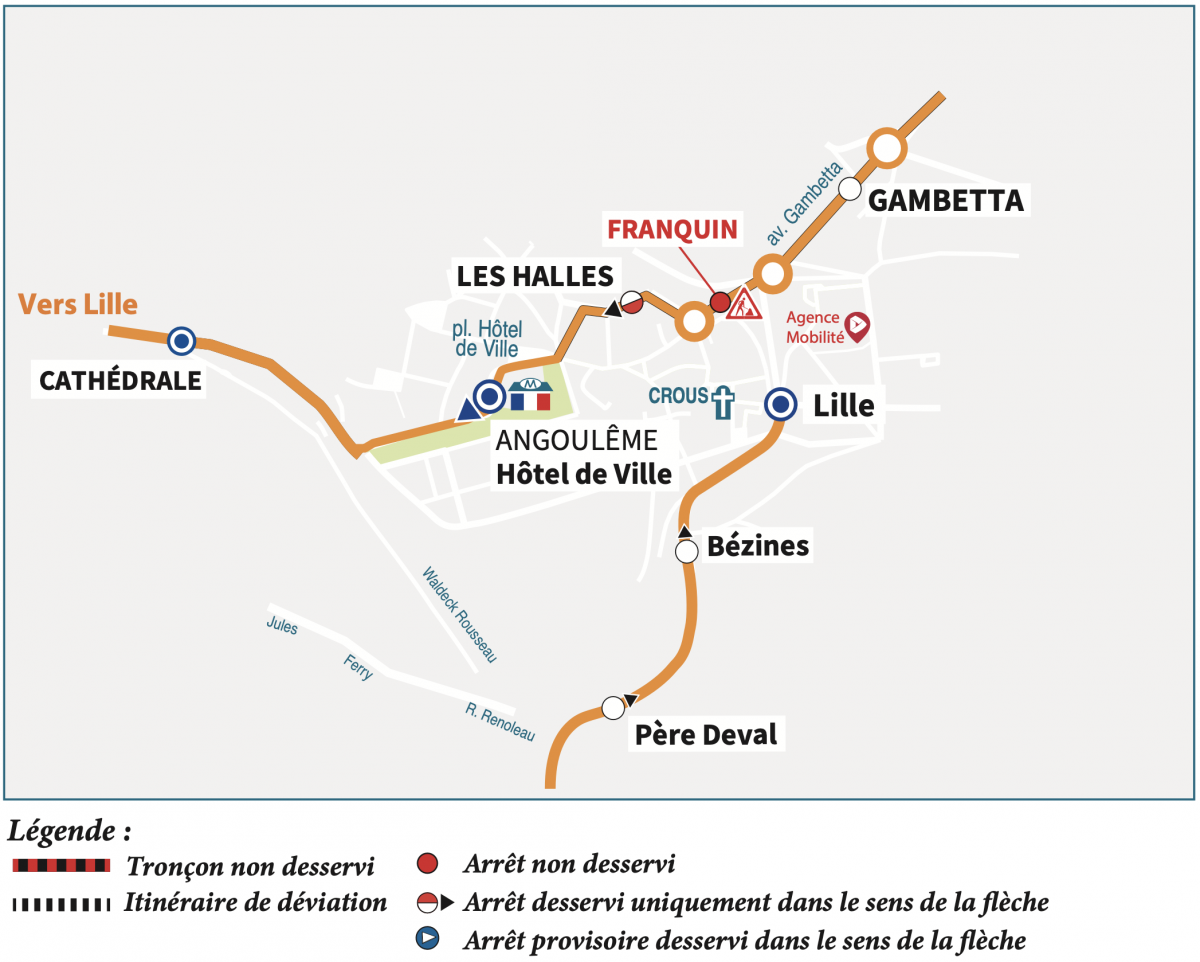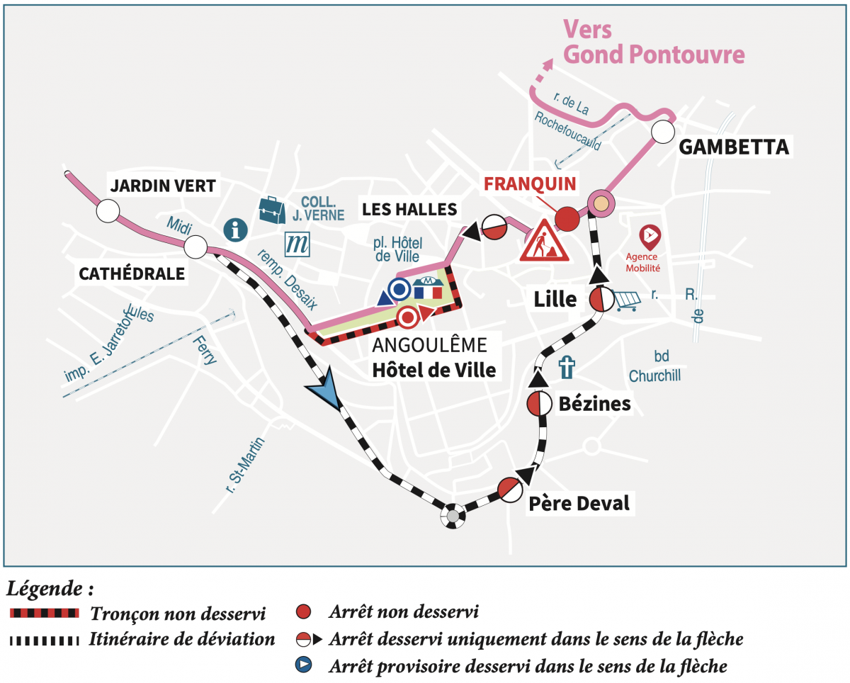 Direction Gond-Pontouvre : nous vous invitons à vous reporter aux arrêts "Cathédrale", "Lille" ou "Gambetta".