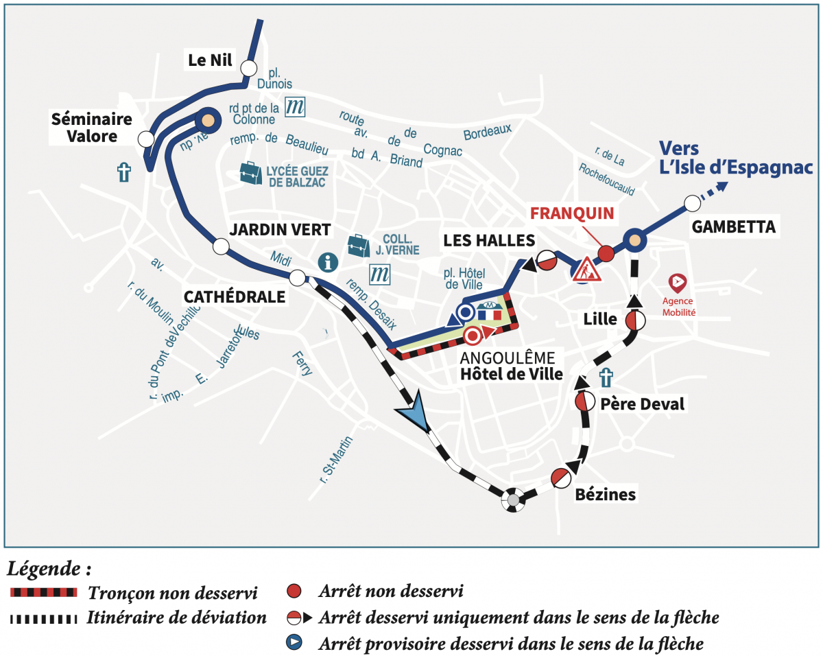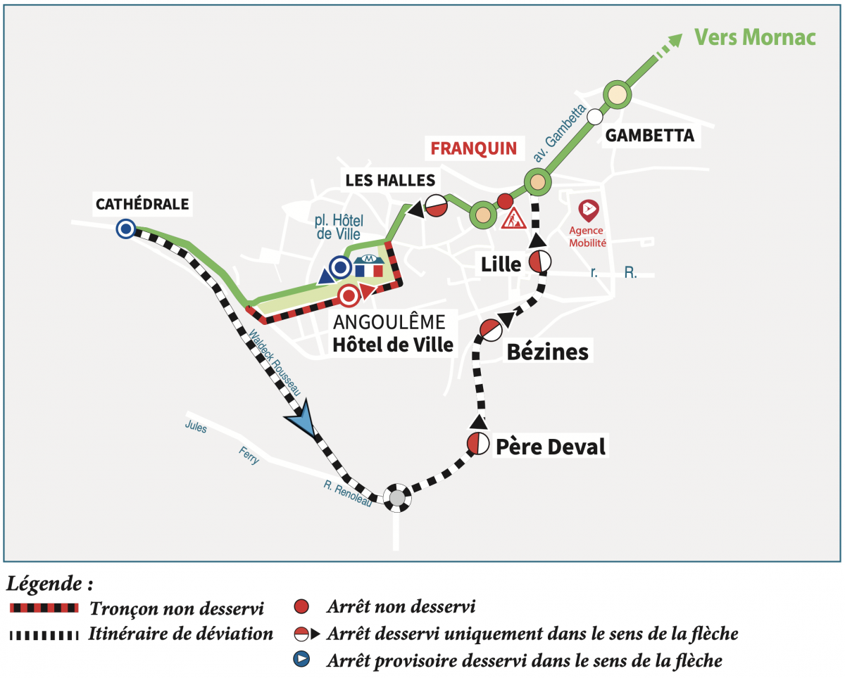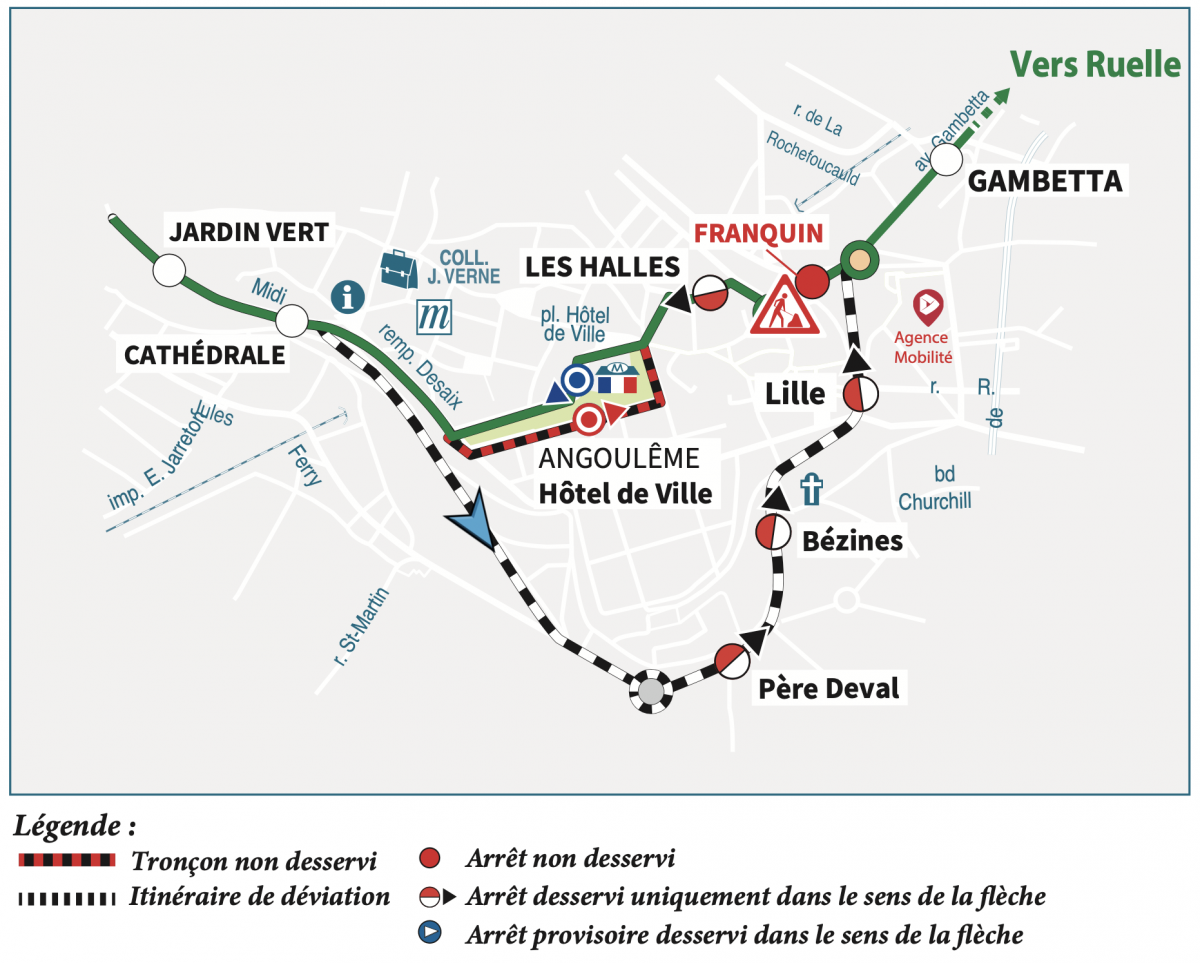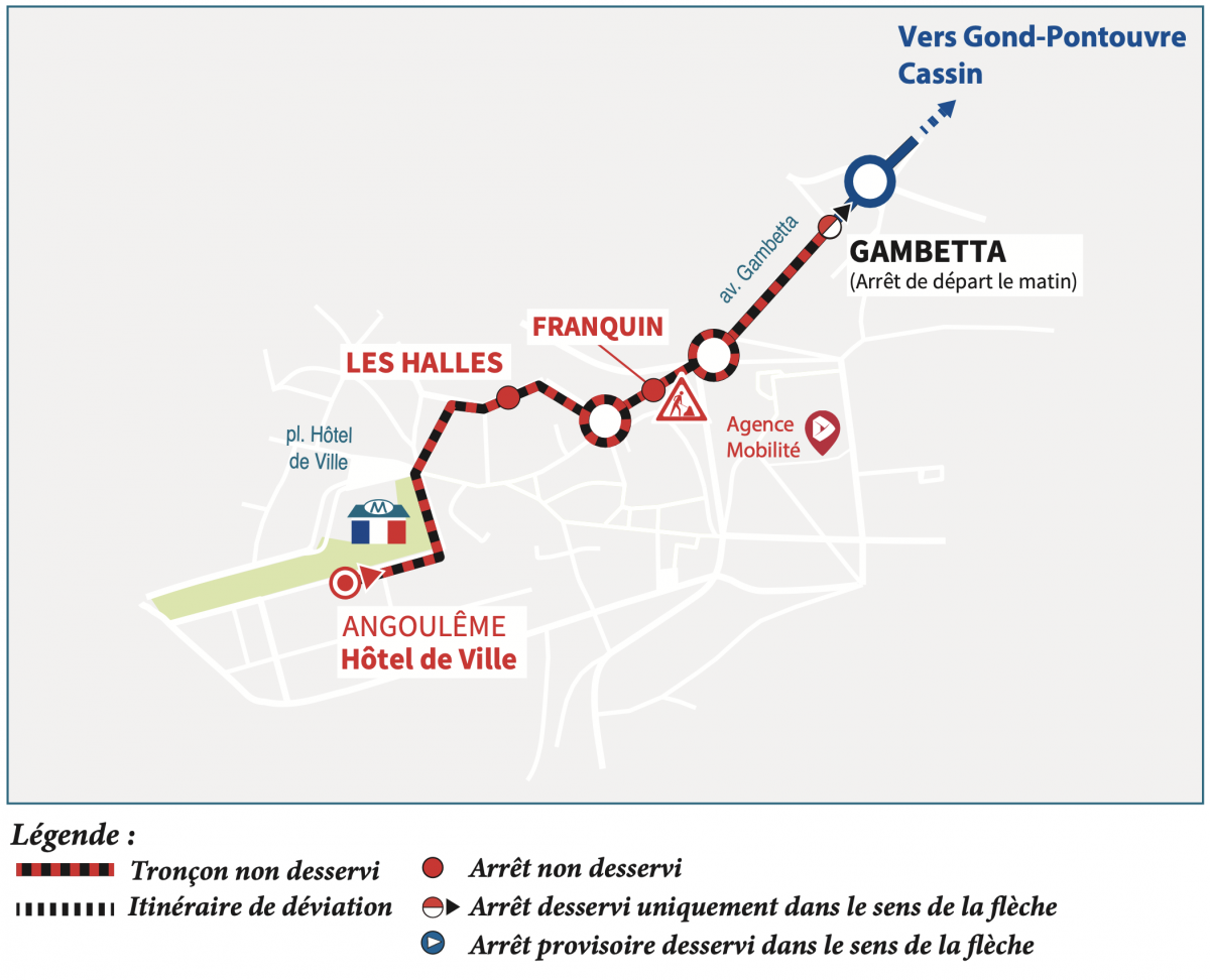 Direction Gond-Pontouvre : nous vous invitons à vous reporter aux arrêts "Cathédrale", "Lille" ou "Gambetta".