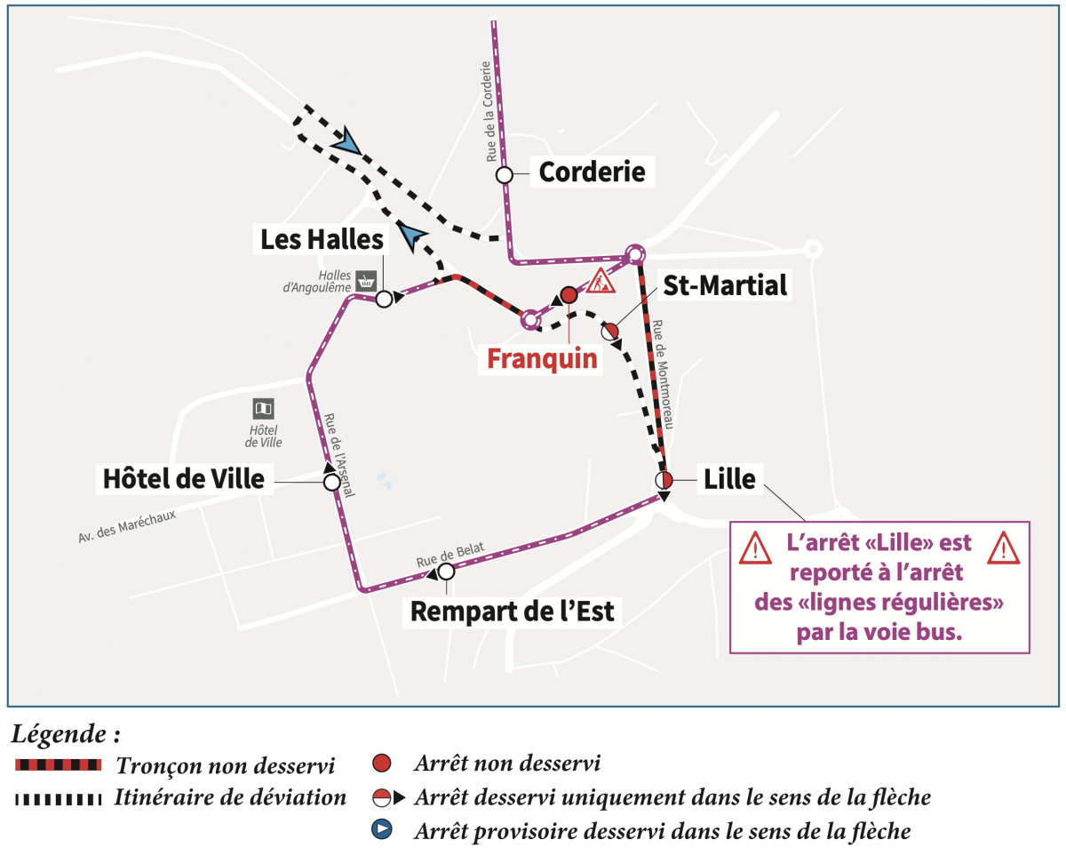 En raison de travaux sur le secteur "Franquin", les lignes de bus seront déviées en centre-ville à partir du lundi 11 mai 2026.